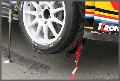 Y aqui el culpable.............la rueda original la perdió, la cambió 500 metros antes de donde estabamos nosotros ( llegó a romper la llanta ), intentó coger el brazo de suspensión con la cinta roja pero la fuerza que llega a hacer acelerando, hizo que no hiciera mas de 100 con la rueda recta, para luego volver a quedar colgando y enganchada al paso de rueda......luego vino el mecánico con un brazo y una mangueta nueva, cambiaron todo mientras iban pasando coches, y a media pasada de los históricos, se fueron para la asistencia.