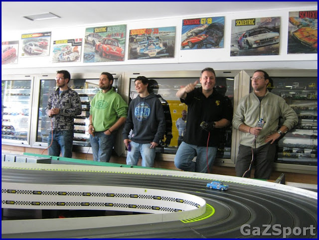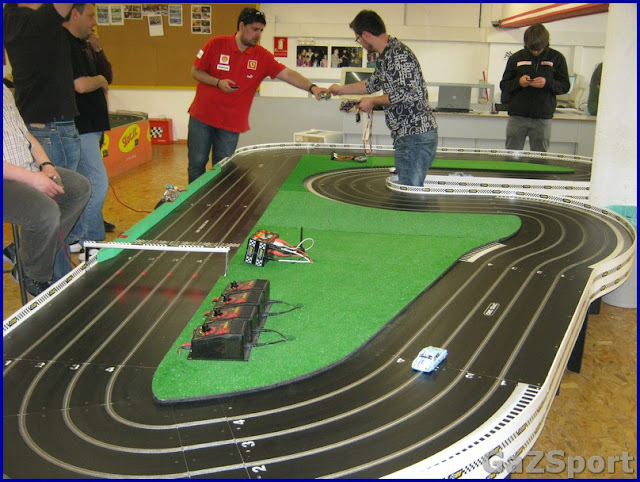 La pista de madera, que el año pasado no nos fué mal, solo algo faltos de desarrollo, este año ibamos con el desarrollo correcto, pero no le encontramos el feeling, había mucho grip y el coche no perdonaba ni una.........es mas, en una pasada de rosca de las mias, el coche se fué recto, saltó la valla y milagrosamente Joan Carles Estebanez lo cogió al vuelo.........gracias Joan Carles! El coche quedó con la carroceria torcida, pero entero........lo enderezamos y seguimos, pero sin feeling.......